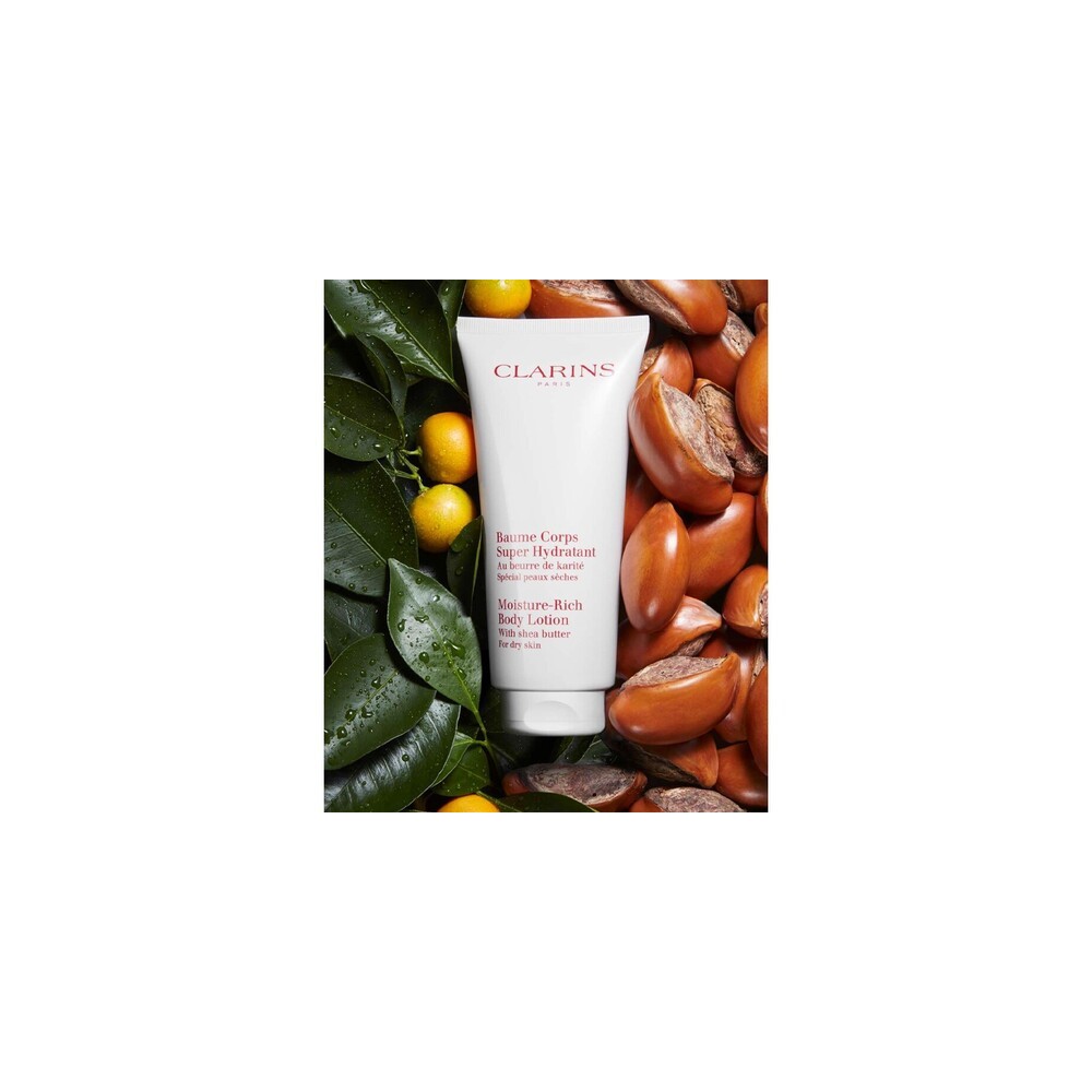 O Baume Corps Super Hydratant nutre e hidrata todos os tipos de pele, mesmo as mais secas graças à sua concentração em manteiga de karité. Os seus extratos de origem natural de água de framboesa bio, de ácidos da polpa do tamarindo e de açúcares de aveia bio suavizam e alisam o grão da pele. A sua textura fundente que penetra imediatamente na pele, permite que se vista rapidamente.